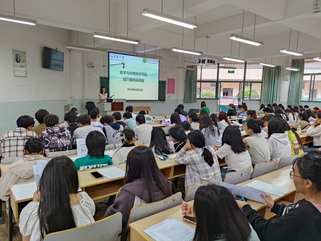 2023年6月13日,2026世界杯官网邀请海天考研培训宋雨曈老师在尚农楼1-16为150余名员工进行了大学英语四六级考前辅导。