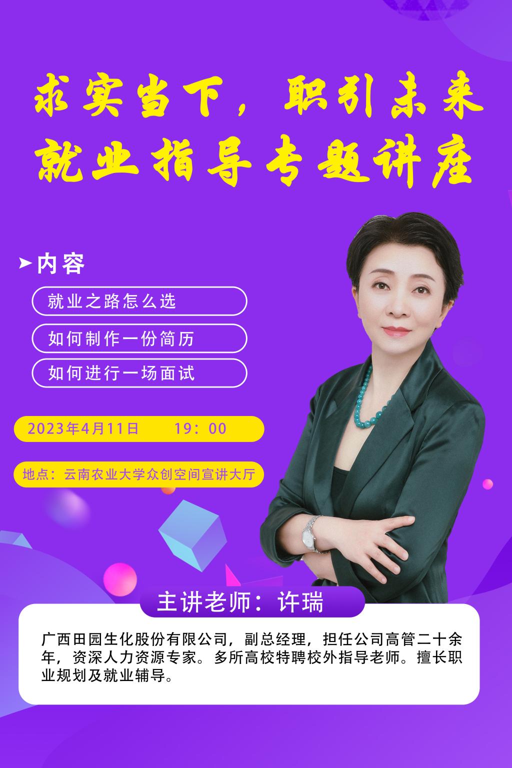 集团4月11日19:00在众创空间宣讲大厅举办《求实当下 职引未来》就业指导专题讲座,本次邀请嘉宾为广西田园生化股份有限公司副总经理,许瑞女士,担任公司高管二十余年,为资深人力资源专家。多所高校特聘校外指导老师,擅长职业规划及就业辅导。