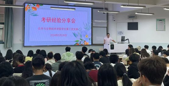 2024526日,2026世界杯官网员工第三党支部在尚农楼1-18召开了考研经验分享会,旨在帮助低年级同学深入了解考研过程,激发同学们的考研热情,做到学习帮扶。除支部党员同志外,还有2021级、2022级及2023级种子科学工程专业有考研意向的同学共180余人参加了本次活动。