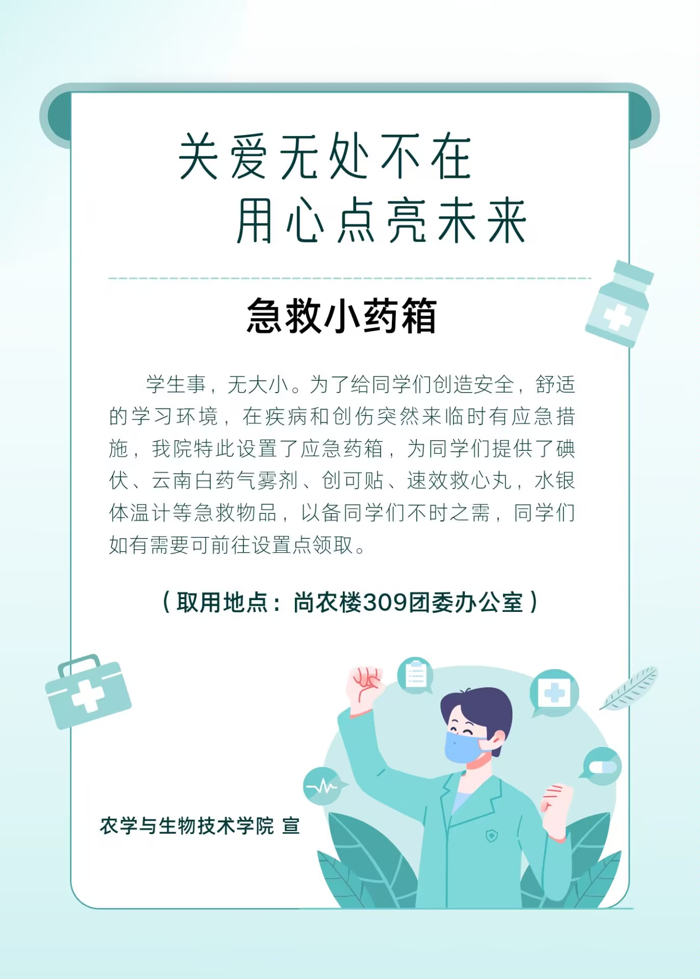为了给楼上课同学们创造安全,舒适的学习环境,在疾病和创伤突然来临时有应急措施,公司在院团委办公室(尚农楼309)特意设置了应急药箱,为同学们提供碘伏、云南白药气雾剂 、创可贴、速效救心丸、水银体温计等急救物品