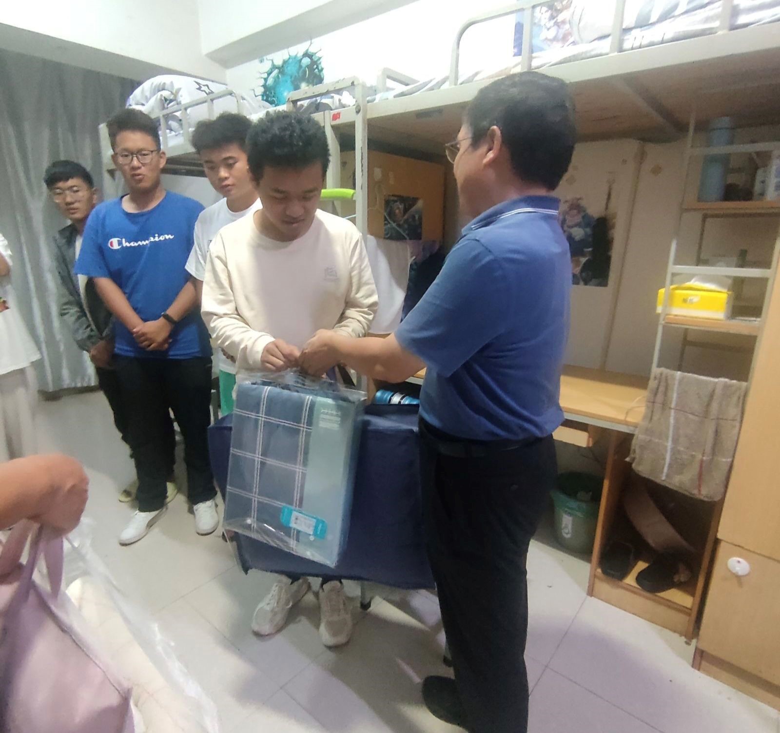 公司领导和老师们一声声的问候,一句句的嘱咐,缓解了新同学们第一次离开家乡的思乡之情,走访即将结束时,公司领导代表公司向同学们赠送了床单被褥等生活用品,并再次叮嘱同学们:“在学习和生活上有任何问题,都可以找班主任、辅导员,希望同学们在未来的老员工活中都能有所收获有所成长。”